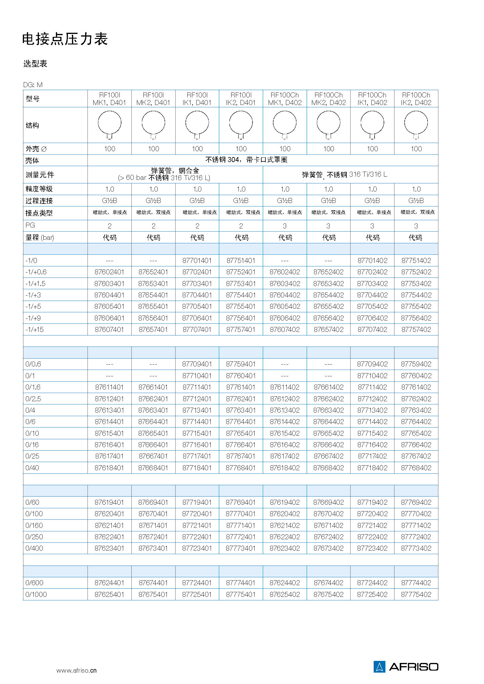 -0.1/0 MPa到 -0.1/+1.5 MPa 0/0.1 MPa到 0/100 MPa |