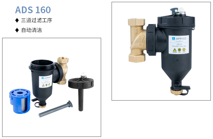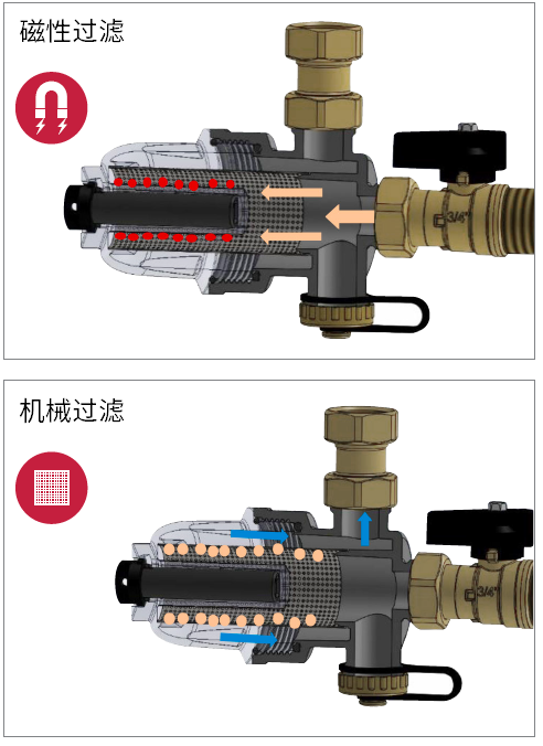 ADS 160 磁性過濾器除壁掛爐系統(tǒng)外也適用于熱泵系統(tǒng),它整合了三重過濾功能:磁性過濾、機械過濾和渦流過濾,其基本原理,是